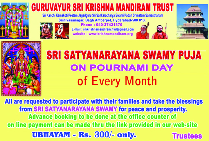 Srinivasa Nagar (Bagh Amberpet) where Lord Guruvayurappan Temple is located has a holy past and an auspicious presence. Devaprasnam indicated that long ago, this Sacred Place was Ashram to holy men and Rishis. The place was full of gardens and lakes and was often visited by celestial beings.